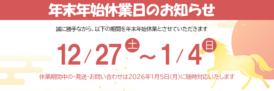 商品発送およびお問い合わせの返信は1/5日(月)からの順次ご対応となりますので、予めご了承下さい。