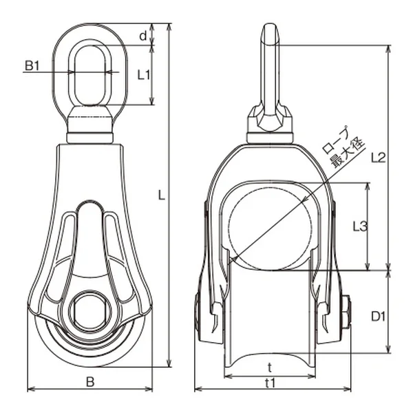 | No. | サイズ(シーブ径) | ロープ最大径 | d | L | L1 | L2 | L3 | D1 | B | B1 | t | t1 | ベアリング呼び番号 | 重量(kg) | 使用荷重(t) |