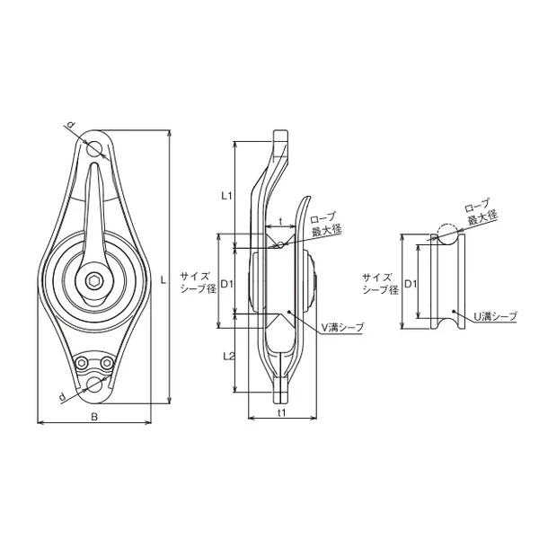 | No. | シーブ | サイズ(シーブ径) | ロープ最大径 | d | L | L1 | L2 | D1 | t | t1 | レンチ径 | ベアリング呼び番号 | 重量(kg) | 使用荷重(t) |