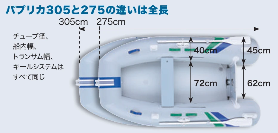 | サイズ (cm) | 全長275・船内長198・全幅152・チューブ径40〜45・船内幅72 |