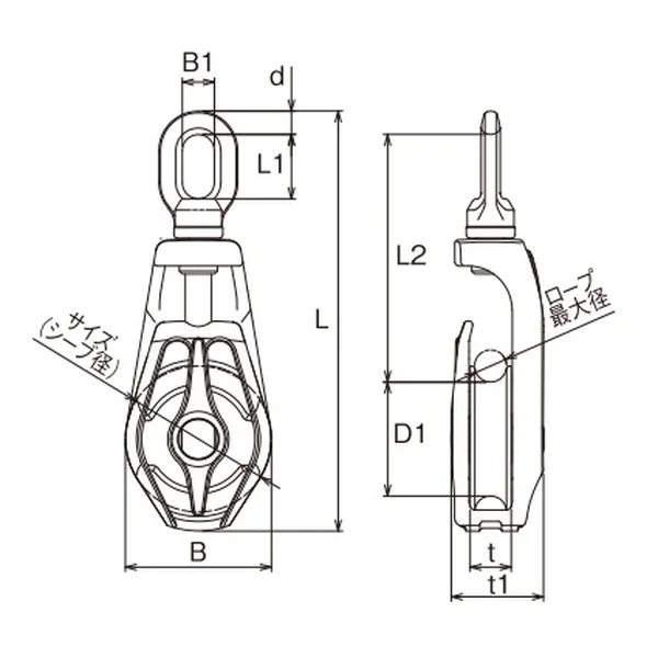 | No. | サイズ (シーブ径) | ロープ最大径 | d | L | L1 | L2 | D1 | B | B1 | t | t1 | 重量(kg) | 使用荷重(kg) |