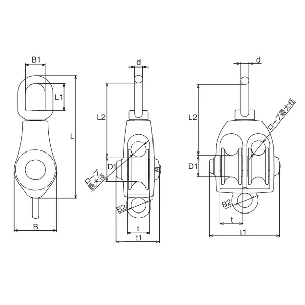 | No. | サイズ(シーブ径) | 種類 | ロープ最大径 | d | L | L1 | L2 | D1 | B | B1 | B2 | t | t1 | 重量(g) | 使用荷重(kg) |