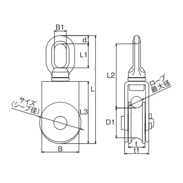 | No. | サイズ(シーブ径) | ロープ最大径 | d | L | L1 | L2 | L3 | D1 | B | B1 | t | t1 | 重量(g) | 使用荷重(kg) |