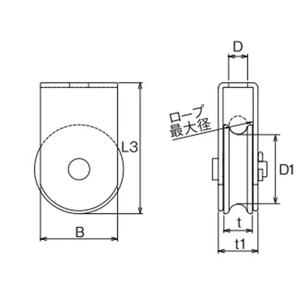 | No. | サイズ(シーブ径) | ロープ最大径 | d | L3 | D1 | B | t | t1 | 重量(g) | 使用荷重(kg) |