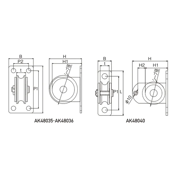 | No. | サイズ(シーブ径) | 使用ロープ径 | H | H1 | H2 | P1 | P2 | L | t | B | 重量(g) |