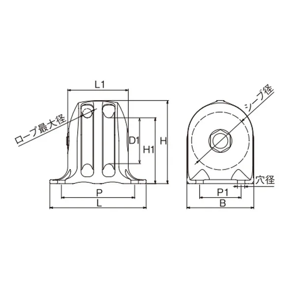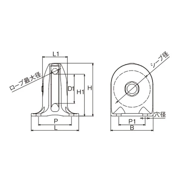 | No. | 種類 | サイズ(シーブ径) | ロープ最大径 | L | L1 | H | H1 | D1 | B | P | P1 | 穴径 | 重量(g) | 使用荷重(kg) |