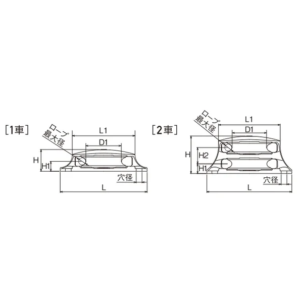 | No. | サイズ(シーブ径) | 種類 | ロープ最大径 | L | L1 | H | H1 | H2 | D1 | B | P | P1 | 穴径 | 重量(g) | 使用荷重(kg) |