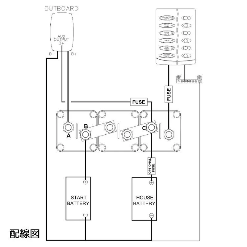 船外機用2バンクバッテリーやシングルオルタネーター用2バンクバッテリー、ツインオルタネーター用2バンクバッテリーに使用できます。