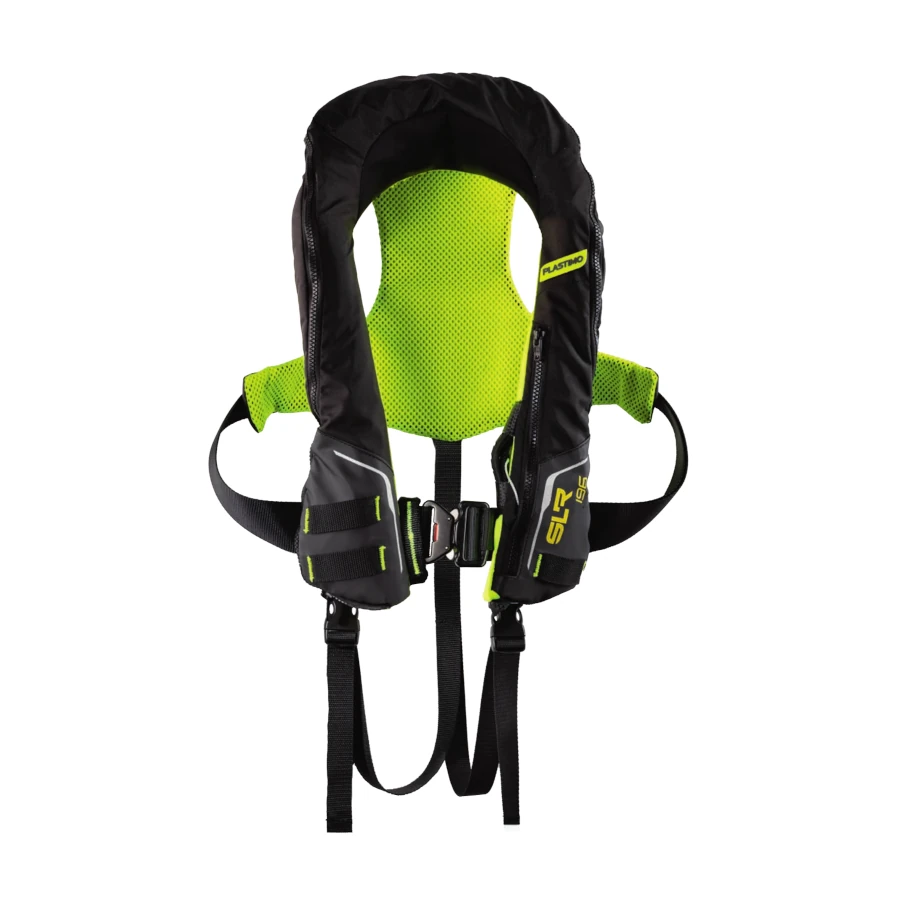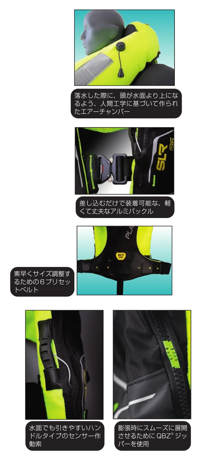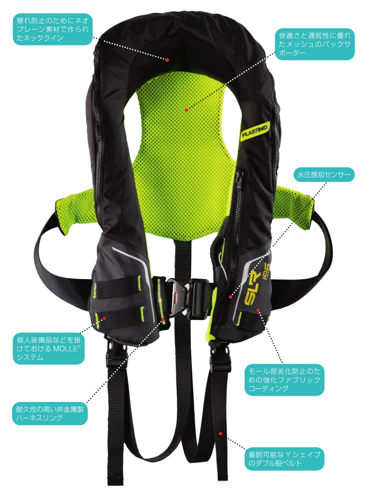 プラスチモが長年ライフラフト等で培った知識を基に設計された独自のエアーチャンバーが、軽量化とパフォーマンスの両立を可能としました。いざ展開してしまった際でも、少しでも顔が上になるように設計されています。長距離レースなどによる疲労を軽減するため極力金属類の使用を控え、軽量化を図っています。また、プリセットされたポジションでのサイズ調整ができるので、意外と面倒だったサイズ調整も簡単に行うことができます。独自のデザイン、ハイテク素材によって開発されたこのSLR196はセーラーにとってレース時には欠かせない存在となりつつあります。
