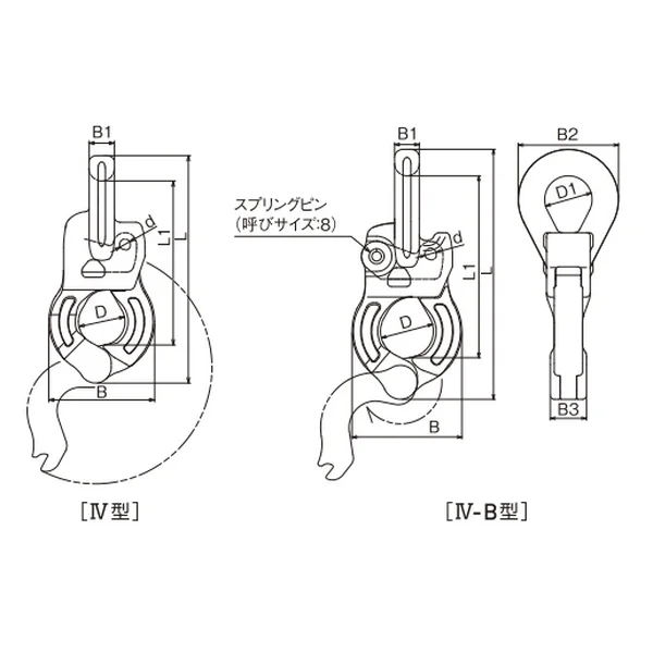 | No. | タイプ | サイズ | D | D1 | d | L | L1 | B | B1 | B2 | B3 | 重量(g) | 使用荷重(kg) |