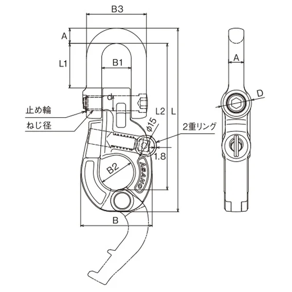 ねじと止め輪で固定する仕様で、ピンの脱け落ちを防止。内側の適度なRがロープを傷みにくくします。