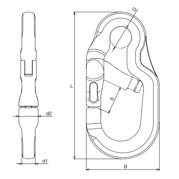 ゲート部分にはインターロック方式を採用。本体とゲートがかみ合うことで高い使用荷重を実現しています。また、ロープや漁網との干渉も考慮し、極力エッジを排除することで、引っ掛かりを防止します。