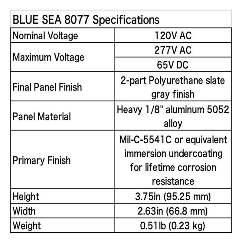 227530 | 定格電圧: 120V AC 最大許容電圧: 277V AC 65V DC パネル仕上げ仕様: 2液ポリウレタン スレートグレー色仕上げ パネル材質:3.2mm厚み アルミニウム5052合金 耐食性のための Mil-C-5541Cまたは同等の浸漬アンダーコート サイズ: 高さ : 95mm 幅 : 67mm 重量 : 0.230 kg |