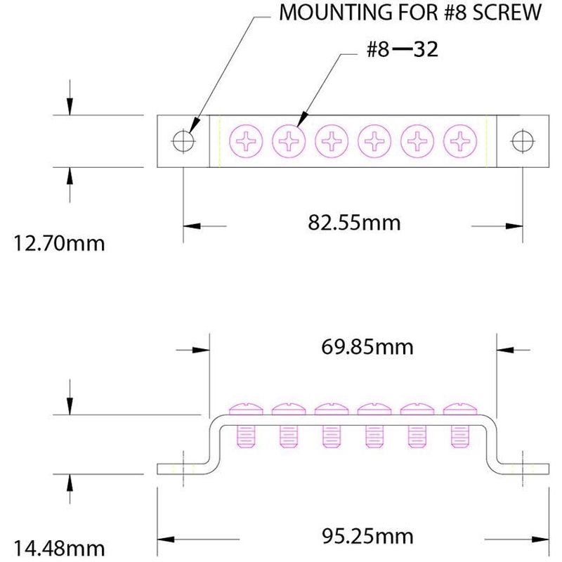 227750 | 150Ampバスバー、6.4mm x 2スタッド、#8(4mm) x 10スクリュー | 150Amp DC、130Amp AC | 48V DC、300V AC | 149x32mm | ||
