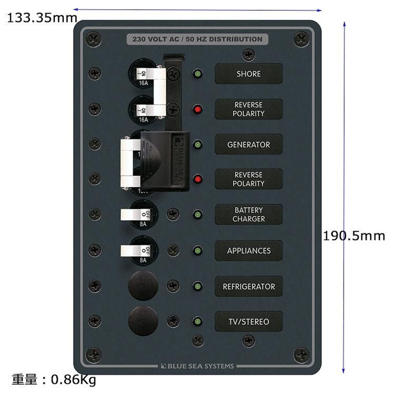 BlueSea AC スイッチパネル、 2ソース + 4回路、230VAC