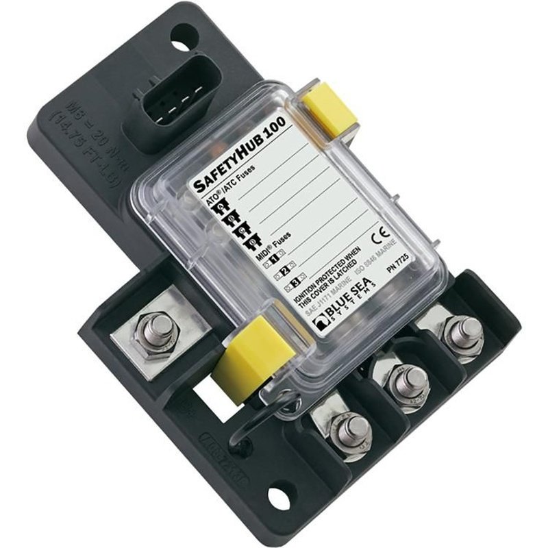 SafetyHub 100は、イグニッション保護されたヒューズブロックと統合された接続プラグを組み合わせています。ガソリンボートでの使用に安全で、配線の接続箇所を減らし、最大7個のヒューズ回路を統合します。