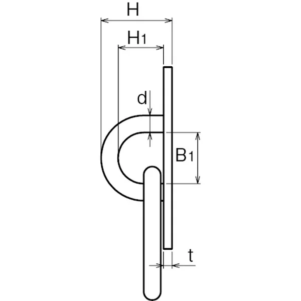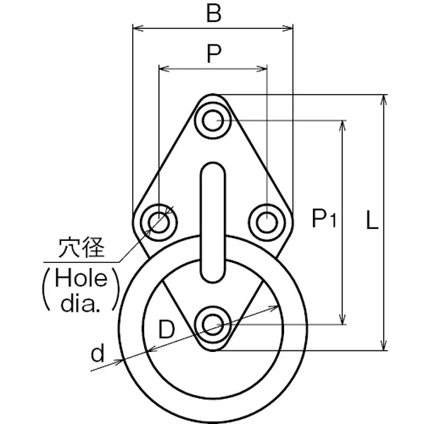 | No. | サイズ | d | L | B | B1 | P | P1 | D | H | H1 | t | 穴径 | 木ねじ径 | 重量(g) | 使用荷重(kg) |