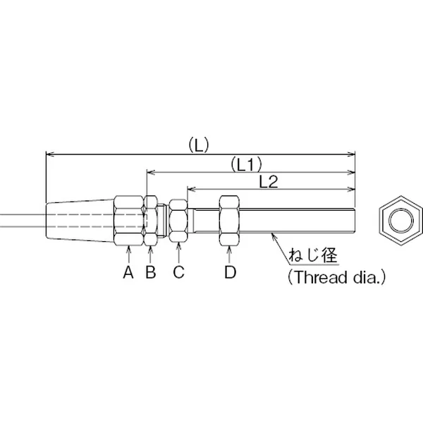 | No.(右ねじ) | No.(左ねじ) | ワイヤー径 | L | L1 | L2 | D | ねじ径 | 六角A面幅 | 六角B面幅 | 六角C面幅 | 六角D面幅 | 重量(g) | 締付トルク(N・mm) | 使用荷重(kg) |
