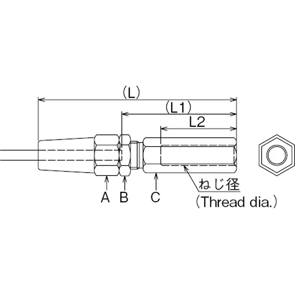 | No.(右ねじ) | No.(左ねじ) | ワイヤー径 | L | L1 | L2 | ねじ径 | 六角A面幅 | 六角B面幅 | 六角C面幅 | 重量(g) | 締付トルク(N・mm) | 使用荷重(kg) |
