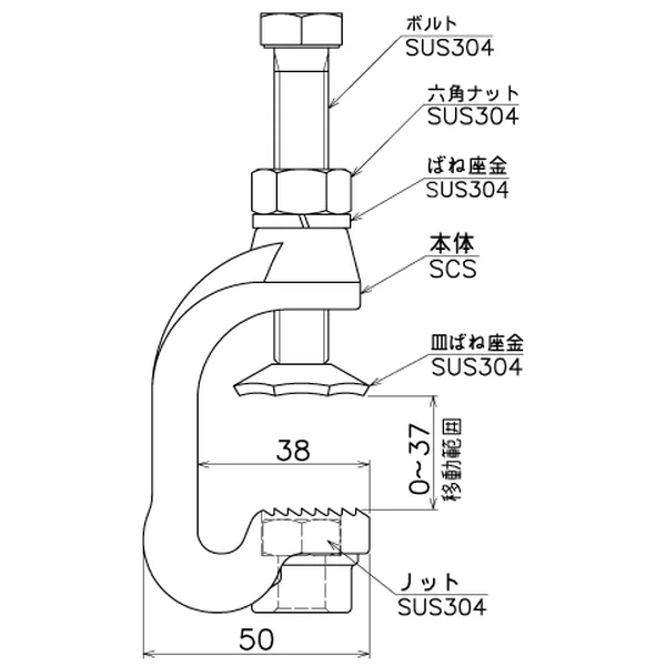 | No. | サイズ(最大S) | L | W | W1 | A | B | ねじ径 | 重量(g) | 荷重方向 | 使用荷重(kg) | 締付けトルク(N・m) |