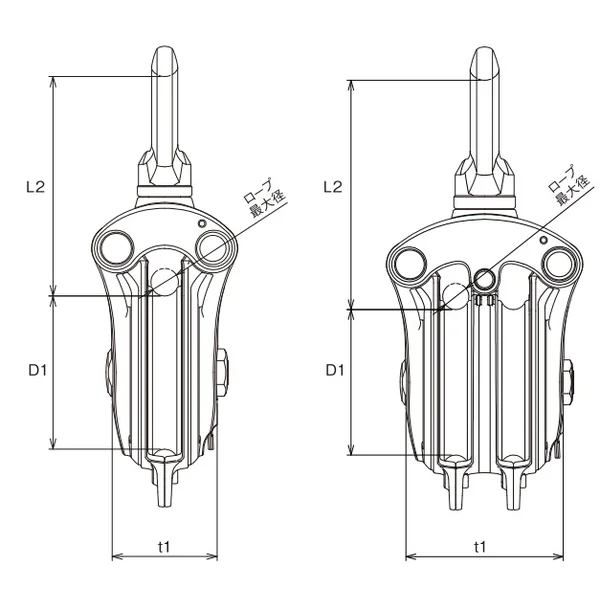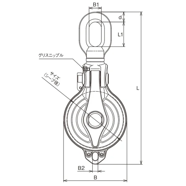 | No. | サイズ(シーブ径) | 種類 | ロープ最大径 | d | L | L1 | L2 | DD1 | BB | BB1 | BB2 | tt1 | レンチ径 | ベアリング呼び番号 | 重量(kg) | 使用荷重(t) |