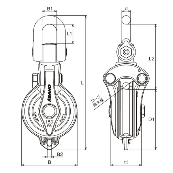 | No. | サイズ(シーブ径) | 種類 | ロープ最大径 | d | L | L1 | L2 | DD1 | BB | BB1 | BB2 | tt1 | レンチ径 | ベアリング呼び番号 | 重量(kg) | 使用荷重(t) |
