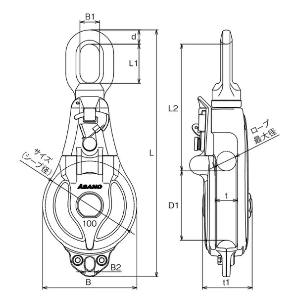 | No. | サイズ(シーブ径) | 種類 | ロープ最大径 | d | L | L1 | L2 | D1 | B | B1 | B2 | t | t1 | 使用六角レンチ径 | ベアリング呼び番号 | 重量(kg) | 使用荷重(kg) |