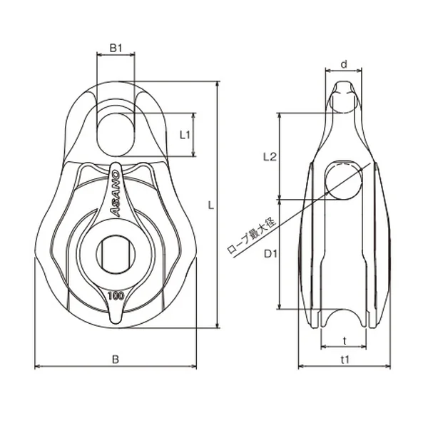 | No. | サイズ(シーブ径) | ロープ最大径 | d | L | L1 | L2 | D1 | B | B1 | t | t1 | ベアリング呼び番号 | 重量(kg) | 使用荷重(t) |