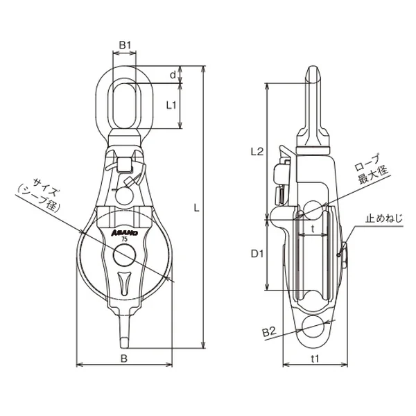 | No. | サイズ(シーブ径) | 種類 | ロープ最大径 | d | L | L1 | L2 | D1 | B | B1 | B2 | t | t1 | レンチ径 | 重量(kg) | 使用荷重(kg) |